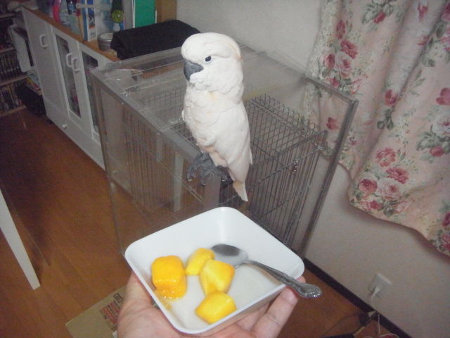 大好きなもの。冷凍マンゴーです。もちろん凍ったままではございませんよ。レンジでチンしてホカホカですwマンゴー食べるときはカゴの中と決めています。外で食わすと周りが汁だらけになりますので。マンゴーを(その他のおやつも)見せるとそそくさと帰っていきます。食えるだけ食います。